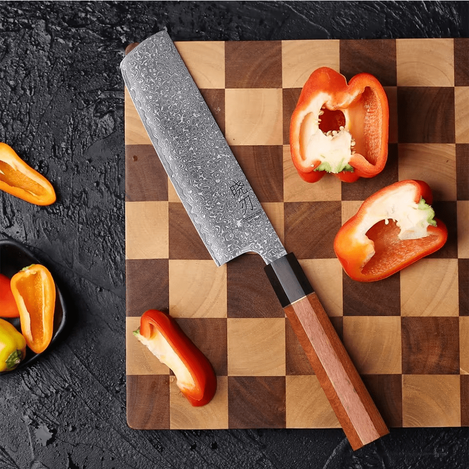 Découvrez l'essence de l'artisanat japonais avec notre couteau Nakiri en acier inoxydable Damas, conçu pour les chefs les plus exigeants.