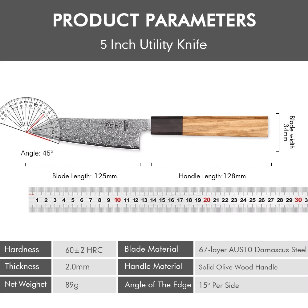 Compact mais redoutable, le Petty japonais est l’allié indispensable pour les gestes minutieux: éplucher, tailler, ciseler avec une agilité chirurgicale. Sa lame en acier Damas 90Cr18MoV, forgée à la main, révèle 67 couches aux motifs fluides, preuve d’un travail artisanal d’exception. Avec une dureté Rockwell de 60-61 HRC, il offre un tranchant ultra fin, durable, toujours prêt à répondre aux exigences des chefs les plus méticuleux.