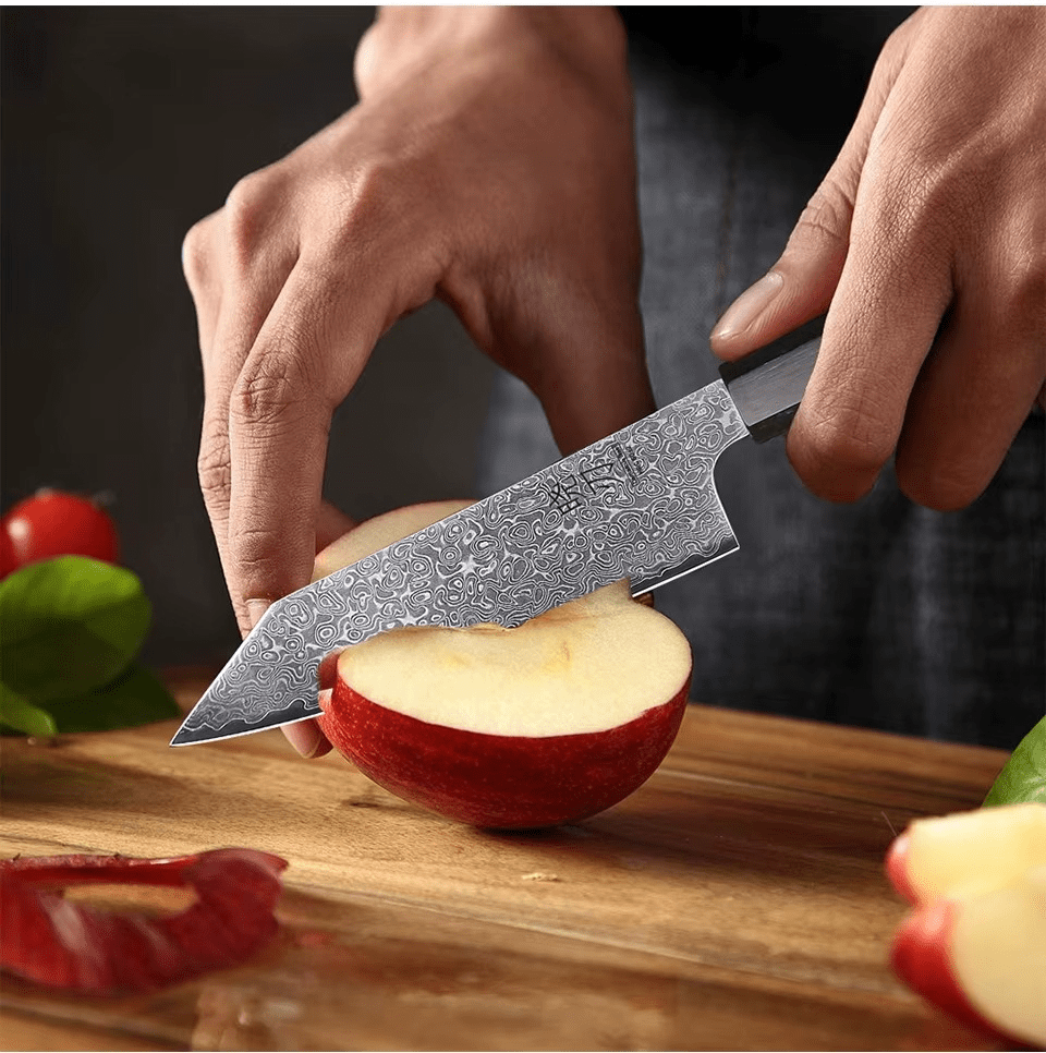 Compact mais redoutable, le Petty japonais est l’allié indispensable pour les gestes minutieux :éplucher, tailler, ciseler avec une agilité chirurgicale. Sa lame en acier Damas AUS10, forgée à la main, révèle 67 couches aux motifs fluides, preuve d’un travail artisanal d’exception. Avec une dureté Rockwell de 60-61 HRC, il offre un tranchant ultra-fin, durable, toujours prêt à répondre aux exigences des chefs les plus méticuleux.