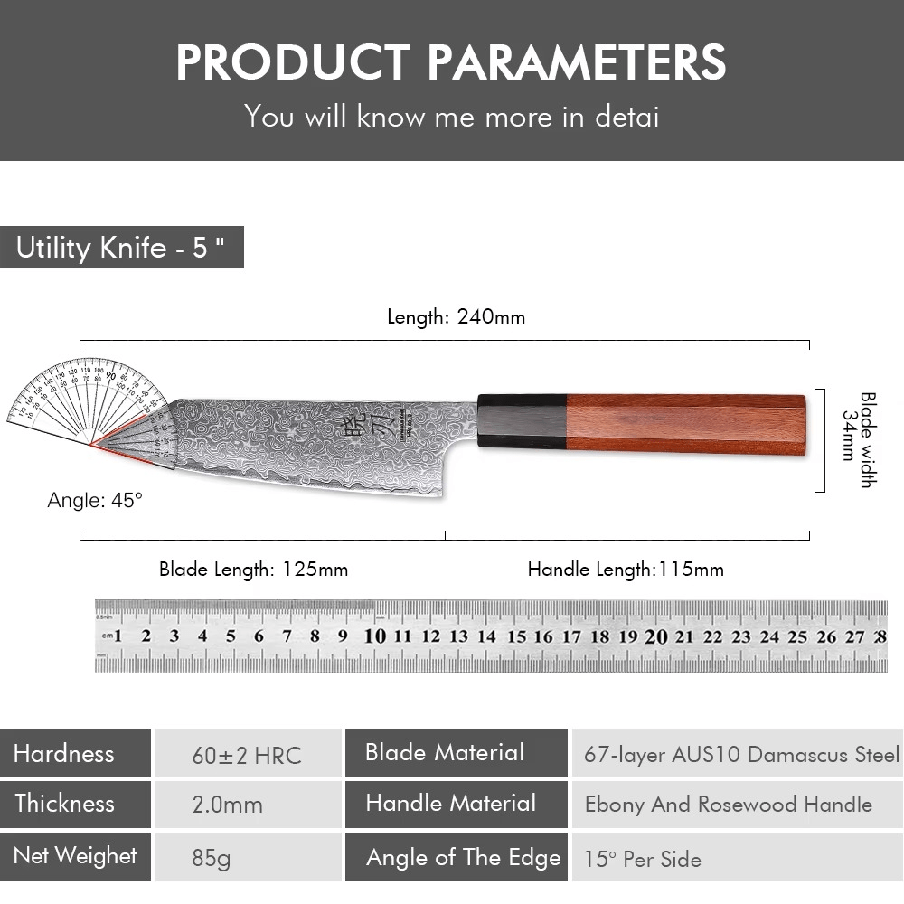 Forgé selon un procédé complexe, chaque lame est composée de 67 couches superposées autour d’un noyau en acier VG-10 japonais, reconnu dans le monde entier pour sa dureté exceptionnelle (60 ± 2 HRC), son tranchant chirurgical et sa résistance à l’usure.