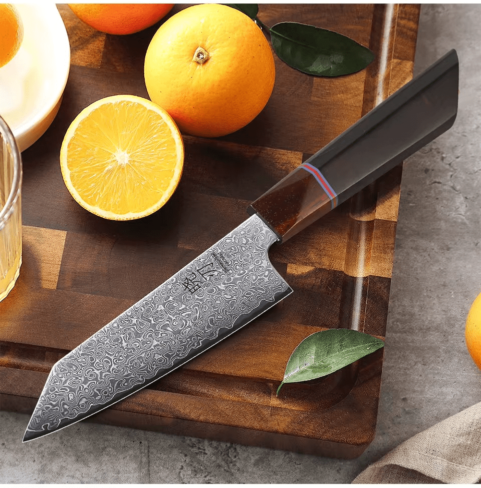 Compact mais redoutable, le Petty japonais est l’allié indispensable pour les gestes minutieux :éplucher, tailler, ciseler avec une agilité chirurgicale. Sa lame en acier Damas AUS10, forgée à la main, révèle 67 couches aux motifs fluides, preuve d’un travail artisanal d’exception. Avec une dureté Rockwell de 60-61 HRC, il offre un tranchant ultra fin, durable, toujours prêt à répondre aux exigences des chefs les plus méticuleux.