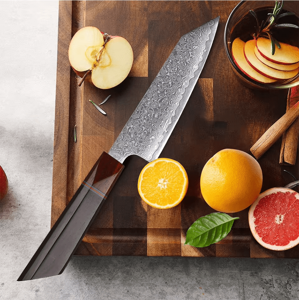 La lame des couteaux Muramasi Japan® est taillée dans un acier Damas 90Cr18MoV à 67 couches et combine la beauté ondulée du damas avec une dureté Rockwell de 60-61 HRC, pour un tranchant rasoir, stable, affûté, conçu pour les coupes longues, nettes et millimétrées.