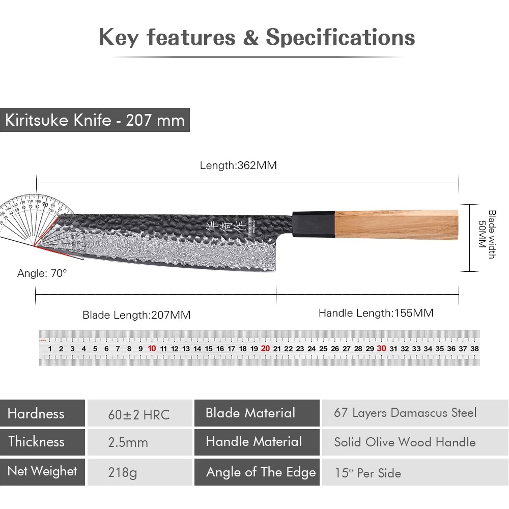 Chaque couteau de ce set exceptionnel est forgé avec 67 couches d'acier Damas, offrant une robustesse et une netteté incomparables. Que ce soit pour trancher, émincer, découper ou hacher, ces couteaux répondent à toutes vos exigences culinaires. De l'élégant Kiritsuke au précis Nakiri, chaque couteau est conçu pour exécuter des coupes parfaites avec une précision chirurgicale. La légèreté de ces lames réduit la fatigue et améliore l'efficacité, faisant de chaque tâche un véritable plaisir.